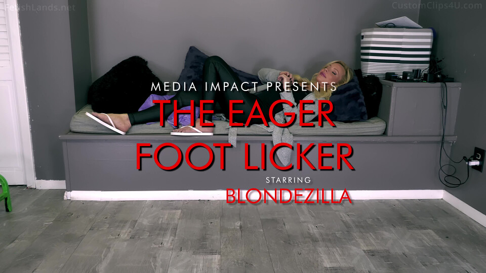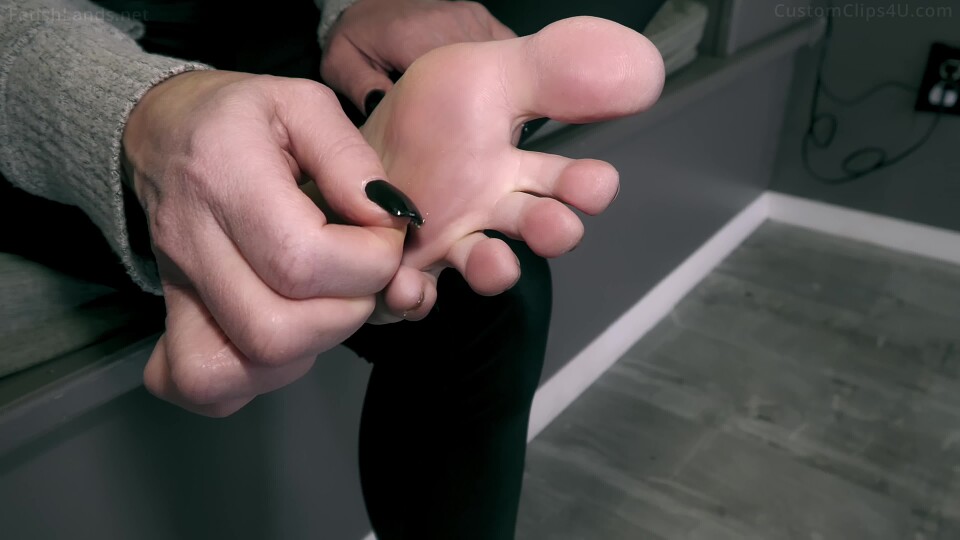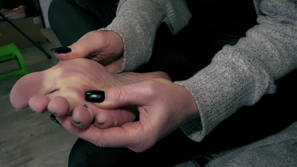 The video opens with her walking up to her tiny stepson, John, on the floor waiting for her. She greets him saying she can see how eager he is for his favorite part of the day: worshipping his giant stepmom's smelly feet after a long day. She stands in her sandals and places her feet in front of him wiggling her toes saying she bets he can feel the heat coming off of her toes as she picks him up to mouth level. She gives him a kiss saying she hopes he enjoys it down there in-between her toes because it's extra stinky there today and chuckling to herself about it and then saying that he knows the drill: soles first then toes then toenails. She takes her sandals off and raises one foot on her knee sole up and rubs his tiny body all over her sole while audibly enjoying it. She does the same with her other sole before placing her feet flat and using his head and upper body to rub deep in-between each toe on both feet, again commenting on how good it feels or saying something about the smell of her feet. She finishes between the toes and use his head to get under her toenails and rubs him all over the big toenail on each foot to get them a little shinier as well before bringing him back up to her face at mouth level.